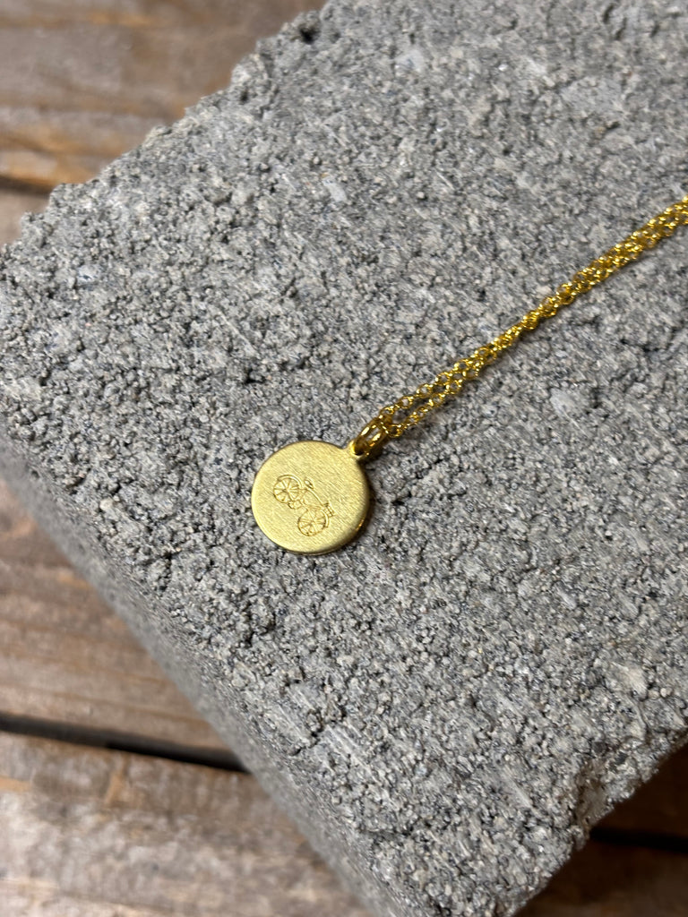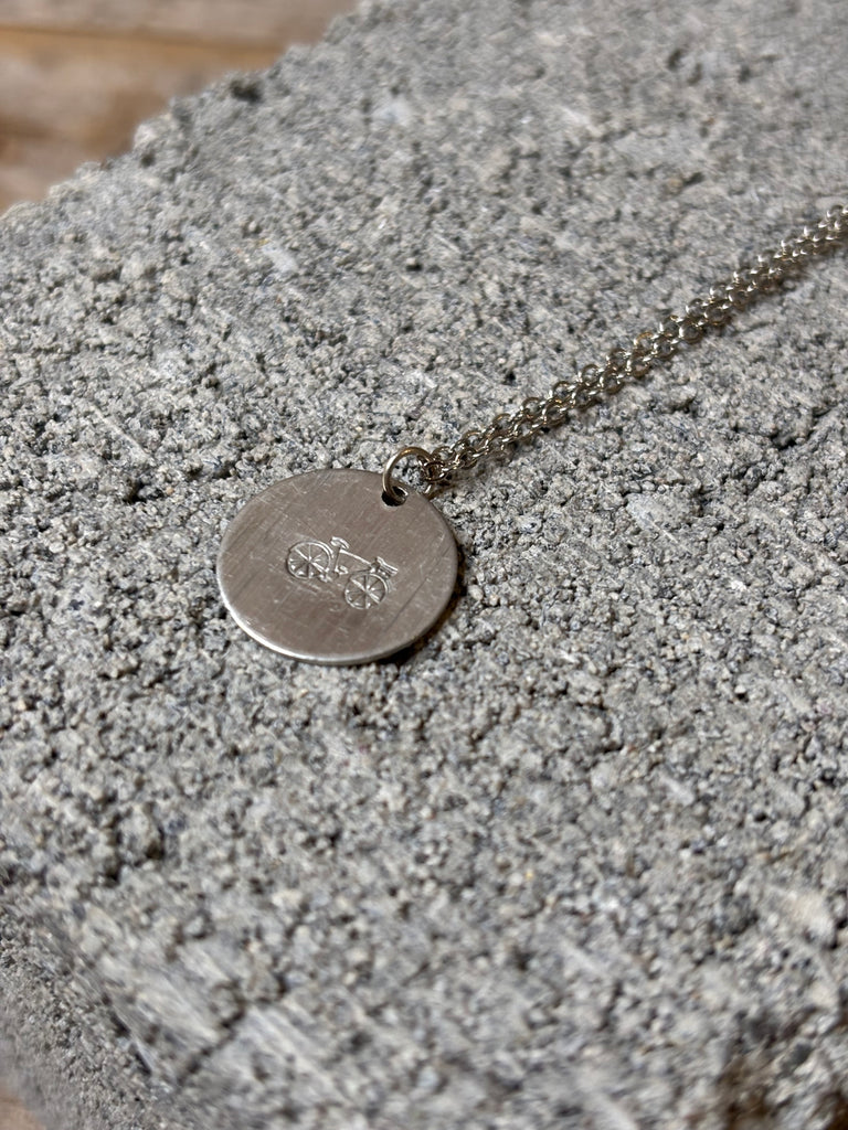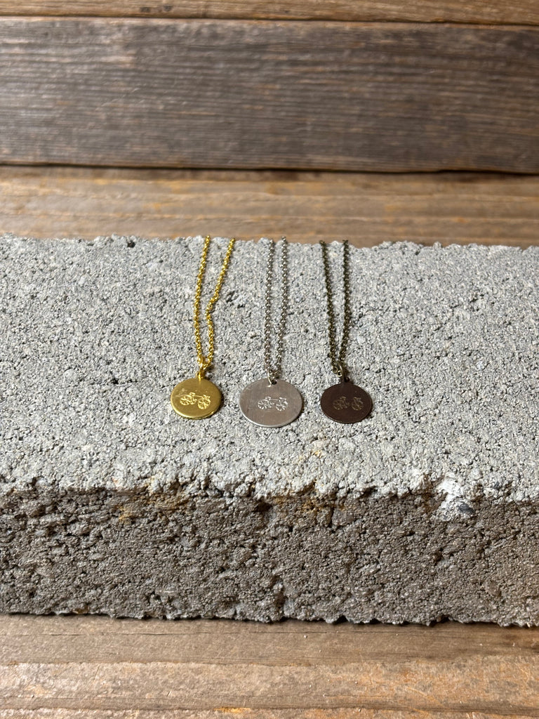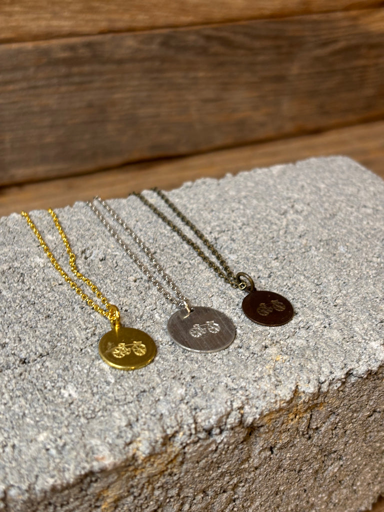 Beautiful hand stamped bicycle necklace.This necklace is on a 16 inch chain. Choose between brass, gold brass, or silver brass.