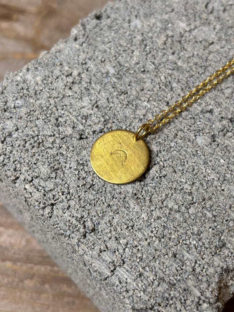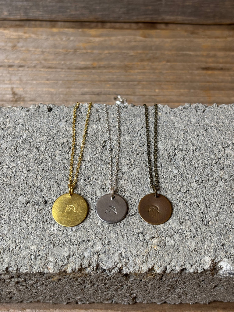 Beautiful hand stamped mountain and sunrise necklace. This necklace is on a 16 inch chain. Choose between gold brass or silver brass.