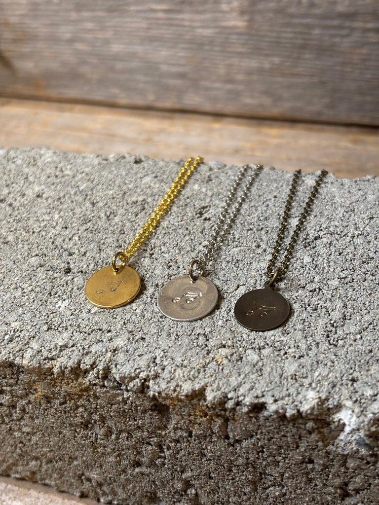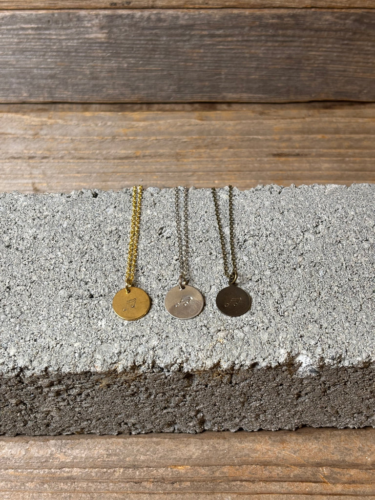 Beautiful hand stamped music note necklace. This necklace is on a 16 inch chain. Choose between brass, gold brass, or silver brass.
