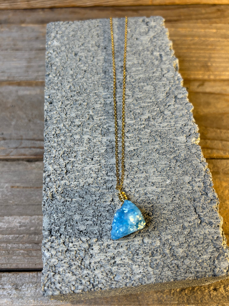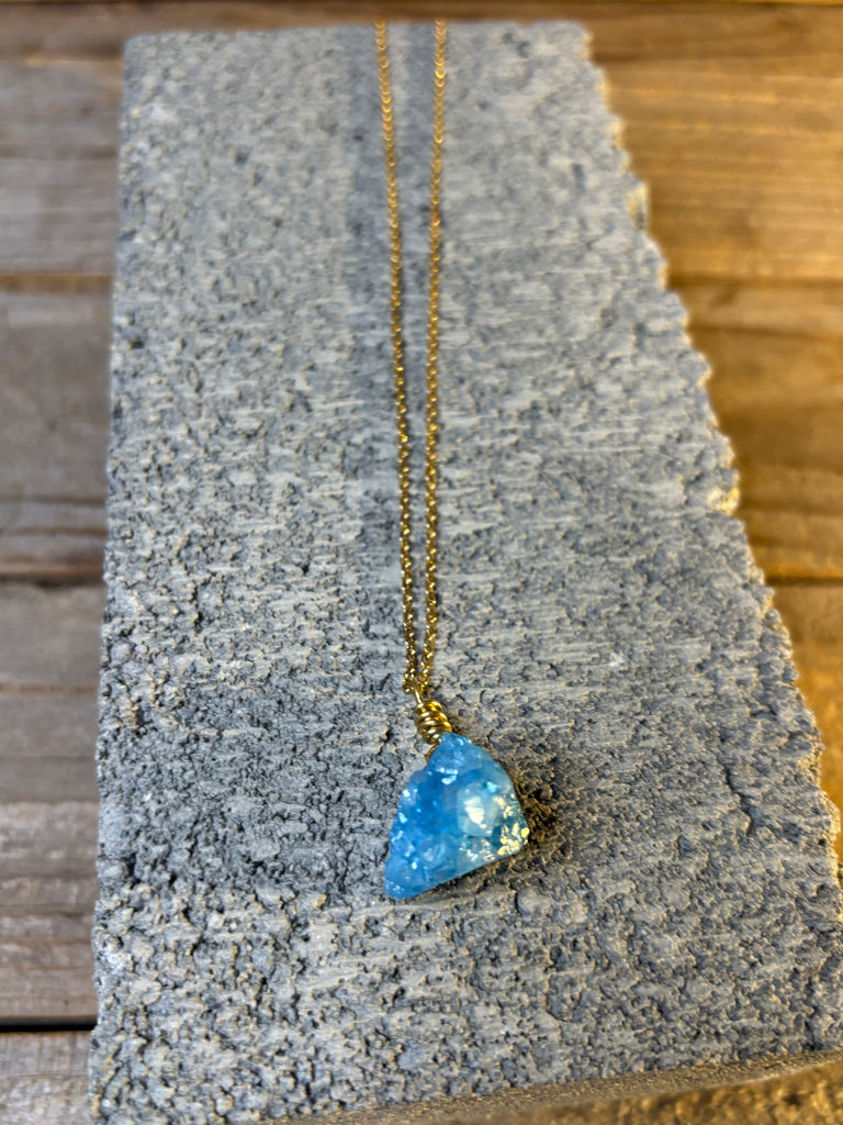 Handcrafted with care, this necklace features a natural gemstone wrapped in detailed wirework, creating a unique and timeless design. The pendant is suspended from an 18 inch brass chain, making it perfect for everyday wear or layering. Each piece is one of a kind, highlighting the natural beauty of the stone.